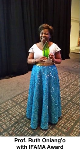 IFAMA President Thad Simons commended Professor Oniang’o’s contributions, stating, “Professor Oniang’o’s firm grasp of African food and nutrition issues has allowed her to serve as Africa’s voice at many international forums and as an advisor to many. Her leadership in the creation and continued oversight of the African Journal of Food, Agriculture, Nutrition and Development has provided an avenue for the publishing of scholarly research and served as a capacity builder for budding academics across the globe. She embodies all of the Continent’s vast promise.”